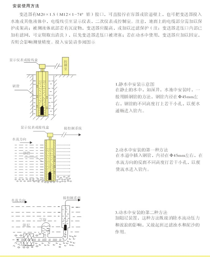 PT311型投入式液位變送器(也稱靜壓式液位變送器)選用進(jìn)口帶防腐膜片敏感組件,將芯片裝入一個(gè)不銹鋼(或PVC)殼體內(nèi),頂部的鋼帽起保護(hù)傳感器膜片的作用,同時(shí)使液體流暢地接觸到膜片。該產(chǎn)品用特制的防水中空電纜使感壓膜片的背壓腔與大氣良好相通,測(cè)量液位不受外界大氣壓變化的影響,測(cè)量準(zhǔn)確,長(zhǎng)期穩(wěn)定性好,并具有優(yōu)良的密封及防腐性能,可直接投入水、油等液體中長(zhǎng)期使用。PVC材料的外殼及電纜可測(cè)量多種防腐蝕性液體。